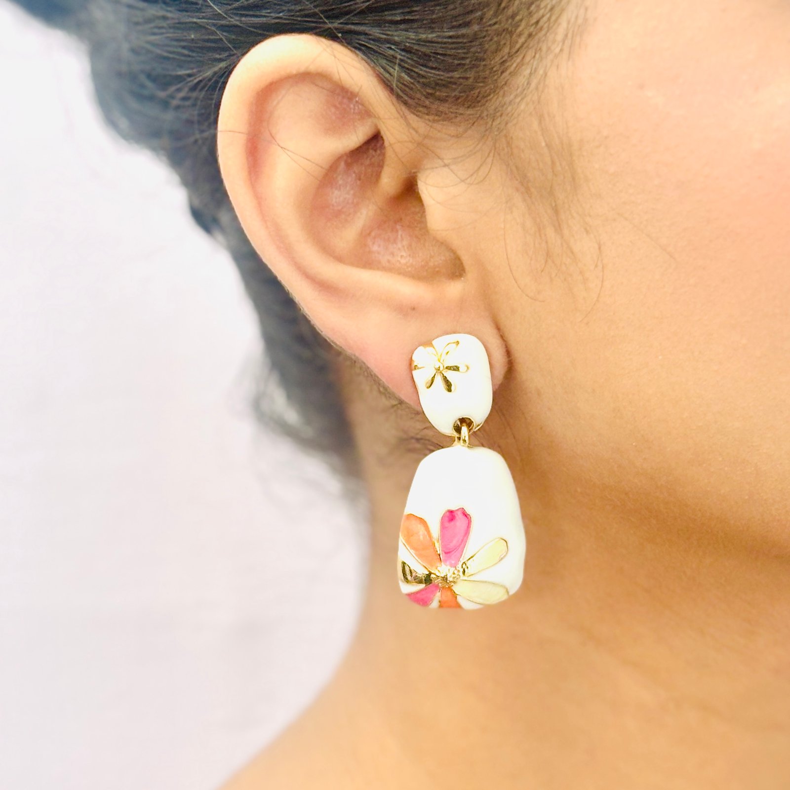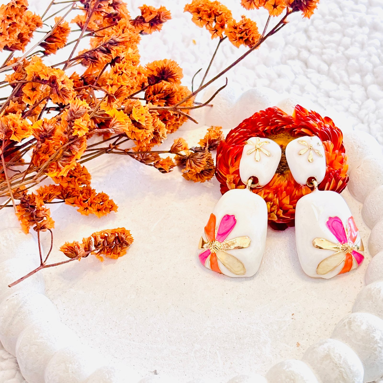Flower Whim captures the joyful spirit of a garden in bloom. Set against a clean white enamel base, these anti-tarnish earrings feature a delicately crafted flower in shades of pink, orange, and golden — radiating charm and whimsy. Lightweight and full of color, they’re the perfect accessory to brighten up both everyday outfits and festive ensembles.
